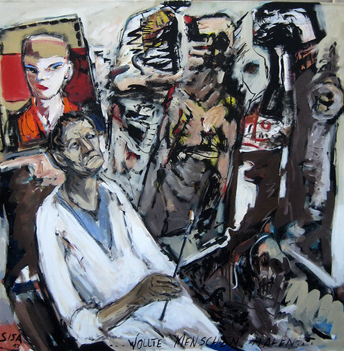 Втім, пейзаж не єдиний жанр живопису, якому присвятив себе Ганс Сіса. Багаторічне захоплення художника невичерпною темою «Людина» (так називається одна з картин, представлених на виставці) символізує весь творчий спектр митця. Він завжди хотів малювати людей, а натомість зображав і зображує людські драми, оголюючи невмолиму правду, що залякує нас, хвилює, як тільки ми стикаємося один на один з її грубою жорстокістю. Здавалося б, непоказна і така відразна самозгуба людини, у безжально правдивих картинах художника, споконвіку була присутня у світі, ніхто не у безпеці від її нищівної дії.