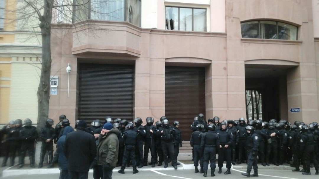 Офіс АО “СКМ” на вул. Десятинній 3а оточений правоохоронцями, які перекривають активістам доступ до будівлі. Учасники акції з вигуками “Ахметова-собаку повісить на гілляку!” збурляли каміння в шибки офісу, а потім вирушили на Михайлівську площу.