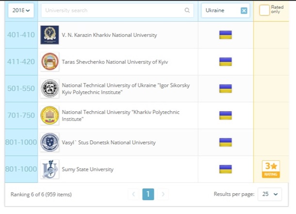 Далі йдуть Київський національний університет імені Тараса Шевченка (411-420), Національний технічний університет “Київський політехнічний інститут імені Ігоря Сікорського” (501-550), Національний технічний університет “Харківський політехнічний інститут” (701-750), Донецький національний університет і Сумський державний університет (801-1000).