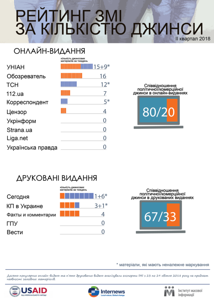 Згідно з результатами дослідження ІМІ, у другому кварталі 2018 року загальне співвідношення джинси без маркування до прихованої реклами з неналежним маркуванням склало 51 до 32 матеріалів відповідно. У першому кварталі 2018 року це співвідношення становило 71 до 12 матеріалів.