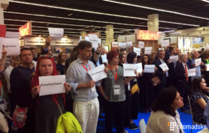 Крім того, на ярмарку українські письменники та перекладачі зачитали оповідання Олега Сенцова та вкотре закликали звільнити українського політв’язня.