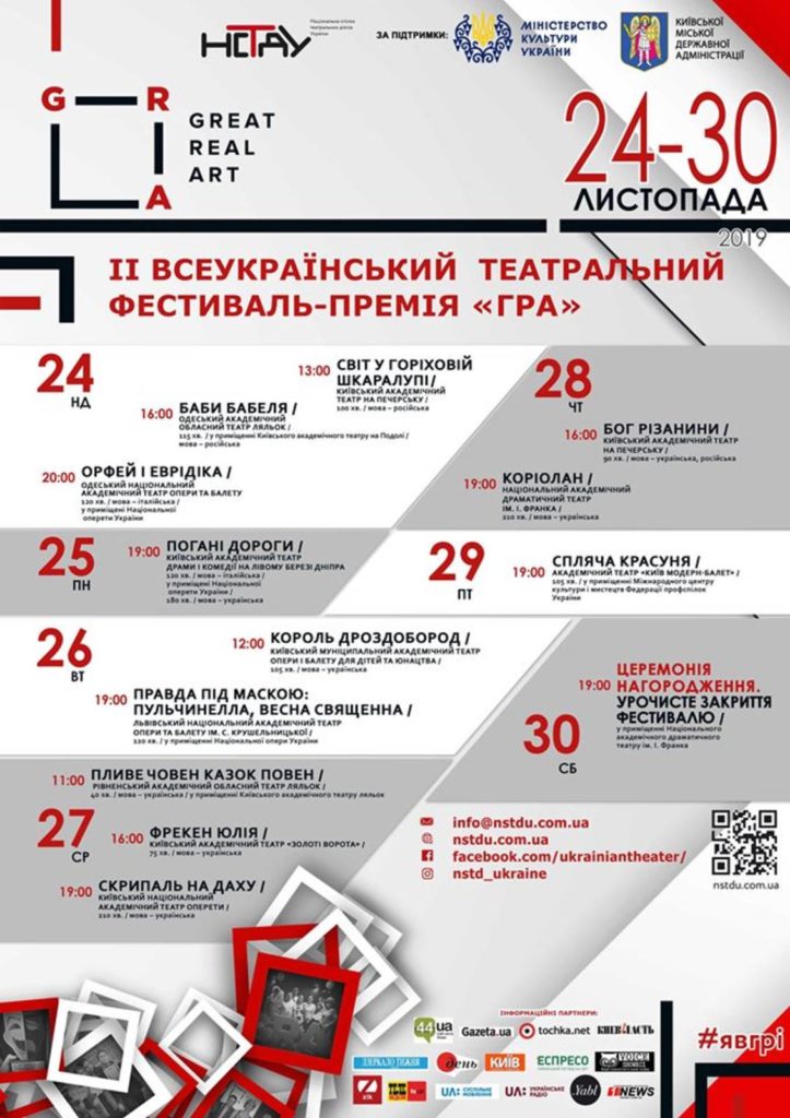 З 24 по 30 листопада кияни мають змогу переглянути фіналістів Другого всеукраїнського театрального фестивалю-премії ГРА на столичних майданчиках. Це 12-ть кращих вистав України, з них – 9 київських постановок. Оцінюватимуть номінантів члени міжнародного журі.