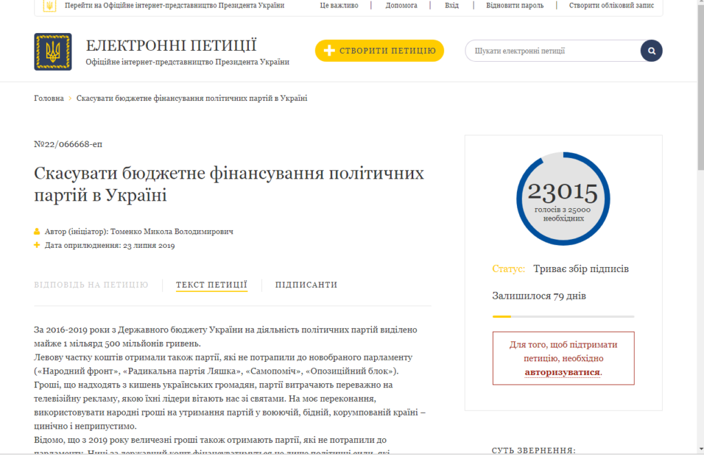 В липні лідер Громадського руху «Рідна країна» Микола Томенко ініціював петицію на сайті Президента України про скасування фінансування політичних партій за рахунок державного бюджету. За два тижні петиція вже набрала майже 23 тисячі голосів.