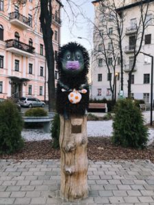Легендарний Їжачок у тумані, у сквері на вулиці Рейтарській, на знак солідарності з киянами, які живуть в умовах карантину, надів на мордочку захисну медичну маску. Хто саме прикрасив скульптуру їжака маскою – невідомо.