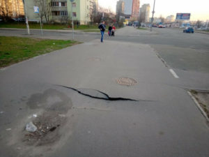 Біля перехрестя вулиць Данькевича і Бальзака велосипедна доріжка частково обвалилася під землю. На місці просадки утворилася велика тріщина, яка може стати причиною смертельної аварії – велосипедист просто впаде, якщо наїде на неї.