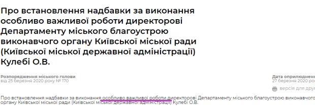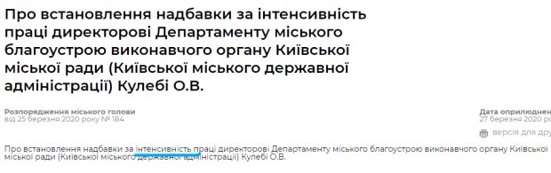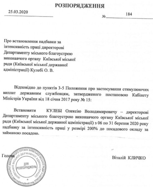 Ще більше дивують цифри, позначені у другому розпорядженні столичного голови – цього ж дня, 25 березня, Віталій Кличко виділив йому ще одну надбавку у розмірі 200 %. А призначена вона, згідно офіційного документу, за інтенсивність праці. І знову жодних коментарів щодо переліку виконаних робіт не надається.