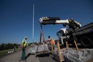 Будівельники вже добудували 90-метровий флагшток до Дня Незалежності, який з’явився на схилах Печерська. Кажуть, що складнощі під час зведення флагштока здебільшого стосувались сильного вітру, що притаманний печерським схилам.