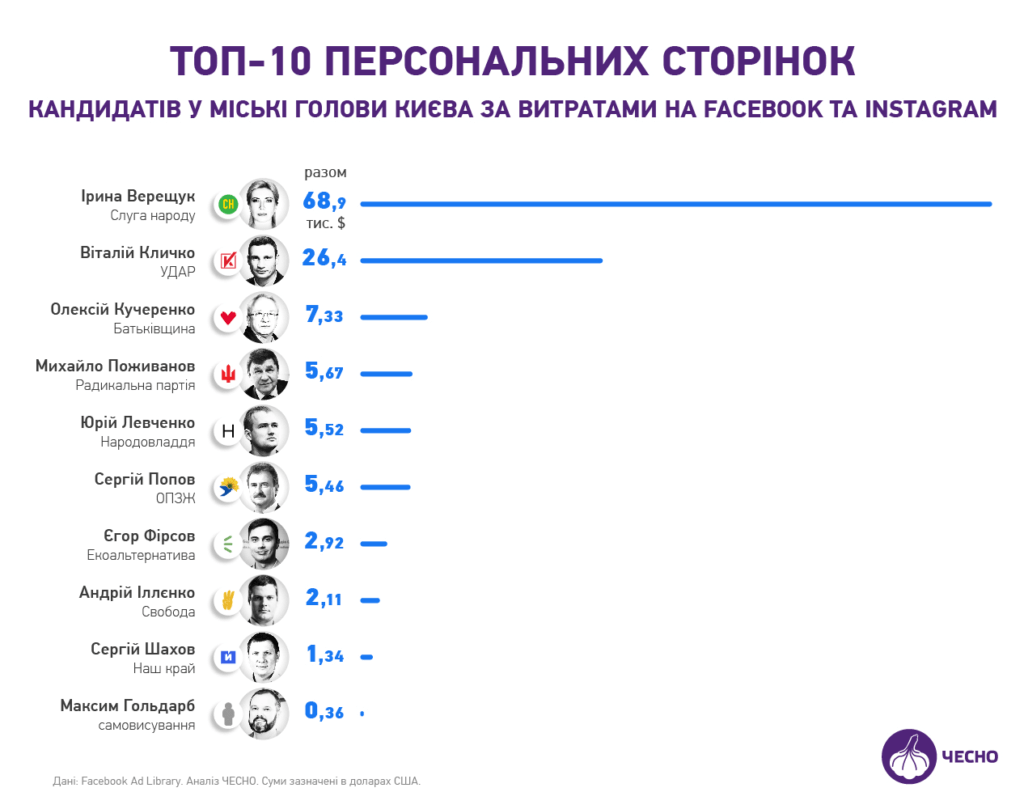 Як пише рух «Чесно», найбільше з персональної сторінки витратила Ірина Верещук («Слуга народу») — майже $69 тис. Це фактично половина всіх витрат столичних кандидатів.