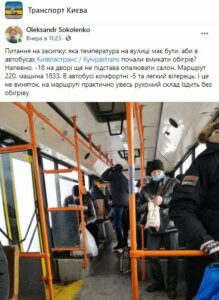 “Питання на засипку: яка температура на вулиці має бути, аби в автобусах Київпастранс / Kyivpastrans почали вмикати обігрів? Напевно, -18 на дворі ще не підстава опалювати салон. Маршрут 220, машина 1833. В автобусі комфортні -5 та легкий вітерець. І це не виняток, на маршруті практично увесь рухомий склад їздить без обігріву”, – зазначив у дописі столичний еколог Олександр Соколенко.