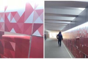 У переході на станції швидкісного трамваю “Політехнічна” кияни зафіксували пошкодження “оздоблення”: шматки  матеріалу зі стін поздиралися та майже готові “відлетіти у небуття”.