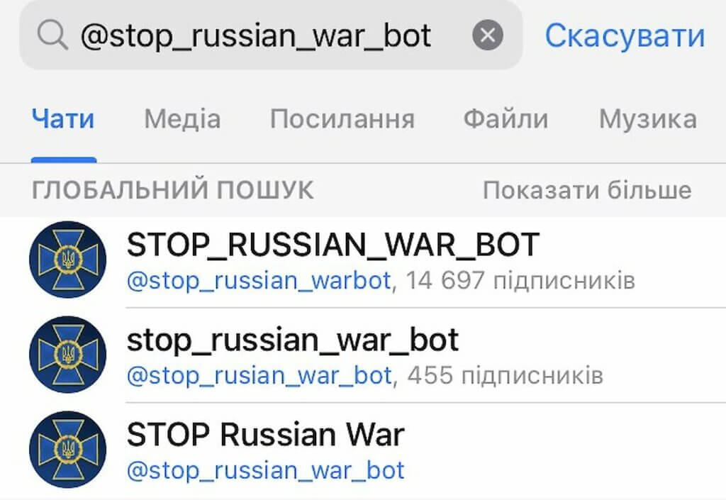 “Бачите російські війська та техніку? Помітили ворожі ДРГ? Повідомте про це негайно! Для цього створено спеціальний ОФІЦІЙНИЙ чат-бот – @stop_russian_war_bot“, – йдеться у повідомленні.
