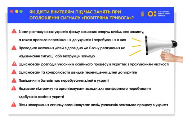 Міністерство освіти та науки розробило алгоритм дій для вчителів у разі увімкнення сигналів тривоги під час занять.