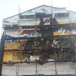 Біля кінотеатру “Жовтень” на вулиці Ярославській, 17 створюють патріотичний мурал “Запорізький месник”. Стінопис присвячено Національній гвардії України.