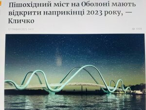 Владні ЗМІ Києва на наші бюджетні гроші повідомили добру новину – пішохідний міст на Оболонь або «Глист Кличка», як проект цього мосту називають в народі, буде відкрито в 2023 році.