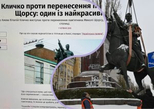Київська влада ж знову чекала, коли випаде сніг і прогримить скандал МЕТРОГЕЙТУ, щоб одразу ж почати демонтаж Щорса. Більше того, ВПЕРШЕ в історії очищення України від русско-советского міра це дійство транслювали в ПРЯМОМУ ефірі муніципального каналу та висвітлювали десятки ЗМІ, як найважливішу подію сторіччя.