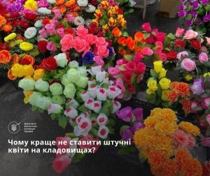 Штучні квіти, які ми звикли приносити на могили рідних, виготовляються з синтетичних матеріалів, що практично не піддаються біологічному розкладанню. Залишаючись на кладовищах роками, а то й десятиліттями, вони забруднюють ґрунт токсичними речовинами, які виділяються в процесі їхнього повільного руйнування під впливом сонячного світла та опадів.
