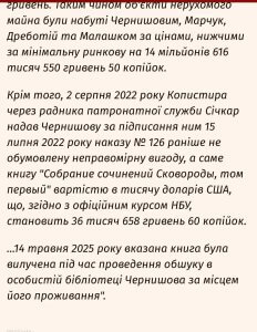 У матеріалах щодо корупційної справи, в якій фігурує віцепремʼєр-міністр, міністр з повернення українців, точніше національної єдності Олексій Чернишов, йдеться про надання йому цінного видання “Собрание сочинений Сковороды, том первый” у формі неправомірної вигоди за сприяння у вирішенні питання.