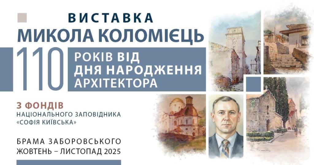 Це – матеріали з фондів «Софії Київської». Центральне місце займають архітектурні креслення Миколи Коломійця – проєкт станції метро «Хрещатик» та ескіз проєкту «Тріумфальна арка в Києві». Окрасою виставки є акварелі, створені ним у процесі досліджень архітектурних пам’яток та під час подорожей Україною й за кордон. Ці твори свідчать про талант митця, в якому поєднались художня майстерність, уважність та точність передачі архітектурних деталей. Виставку доповнюють також світлини будинків культури, зведених за проєктами Миколи Коломійця в різних містах України, йдеться на Фейсбук-сторінці заповідника.