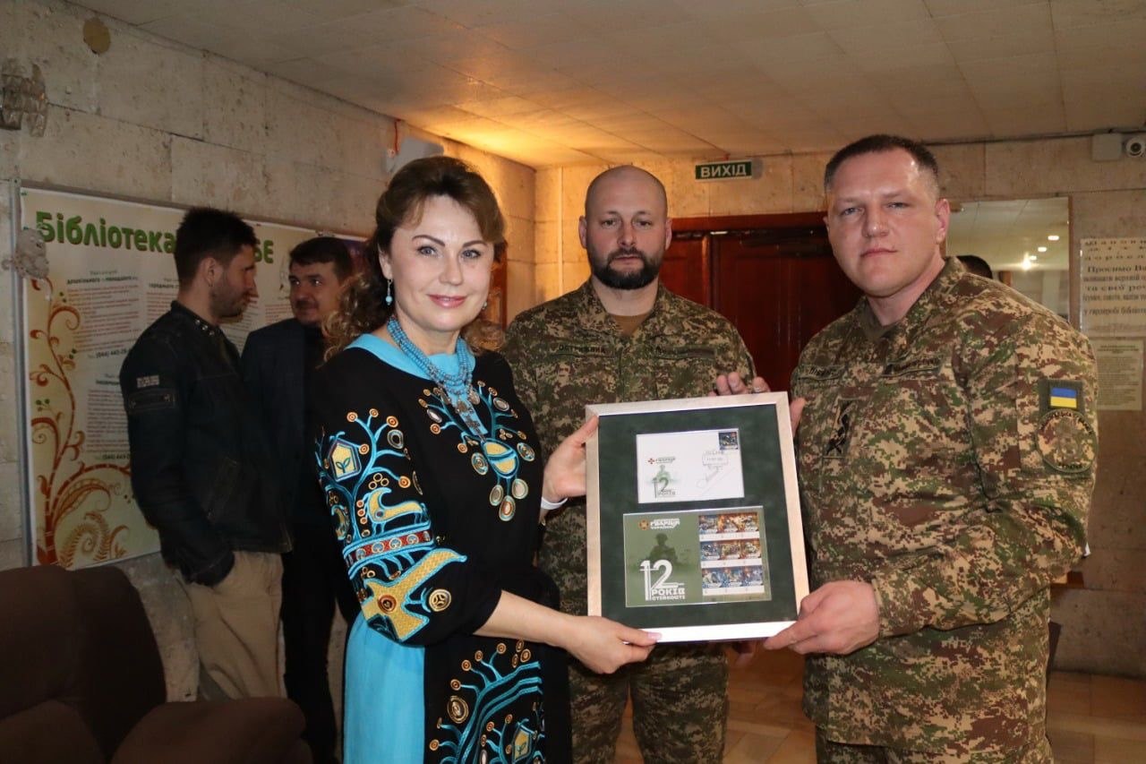 Важливим моментом сьогоднішнього свята стала і церемонія спецпогашення особливого випуску марок – «Національна гвардія України. 12 років стійкості». Її здійснили генеральний директор АТ «Укрпошта» Ігор Смілянський та командувач НГУ генерал-майор Олександр Півненко. Модерувала захід начальник управління маркової та філателістичної продукції Укрпошти Наталія Мухіна. Рамку з конвертом і марковим аркушем зі спецпогашенням командувач передав у подарунок і нашій бібліотеці.