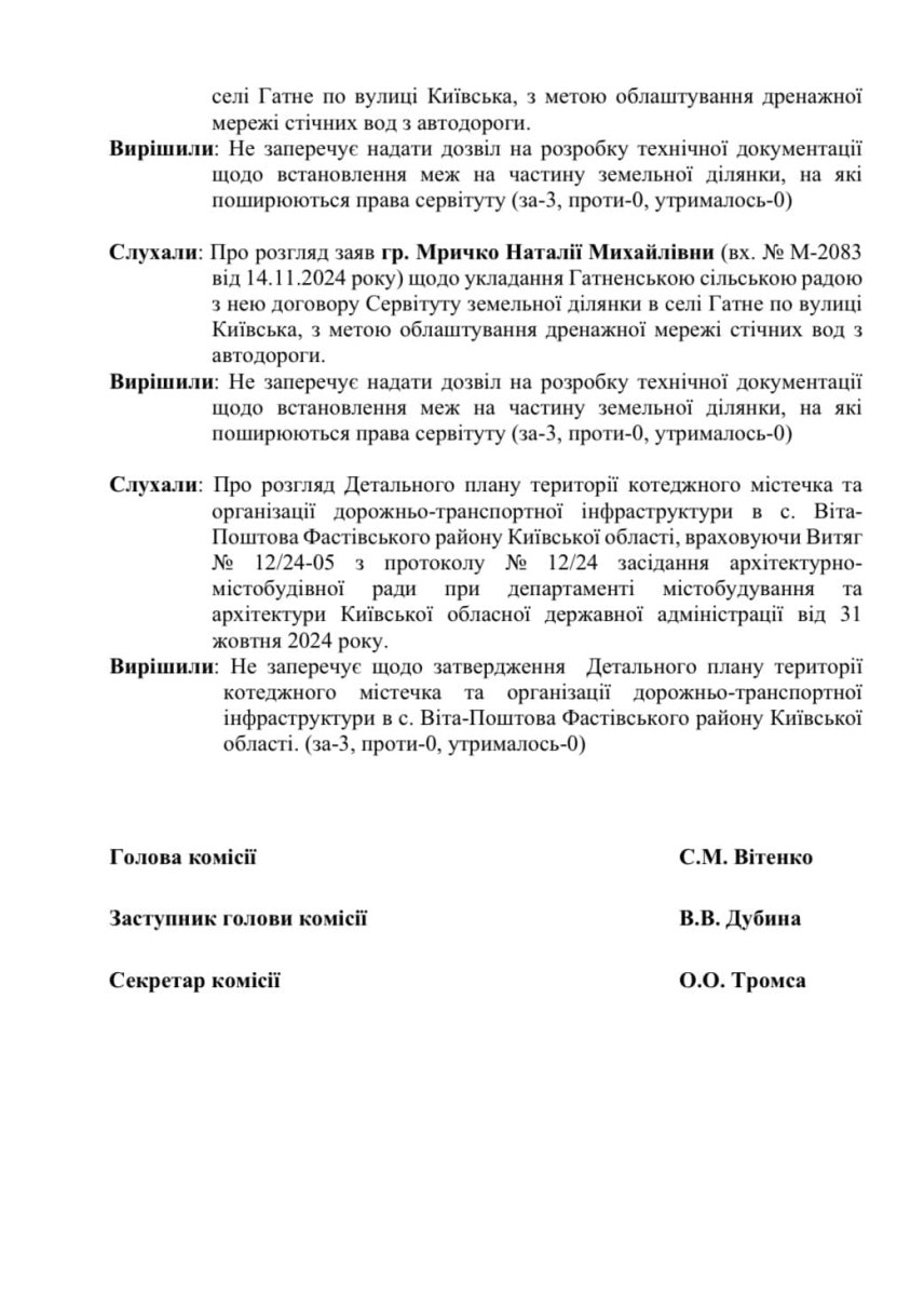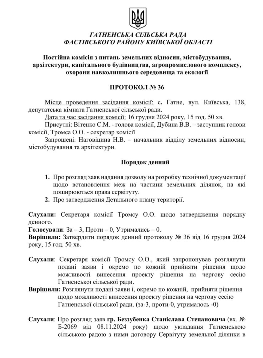 Цікаво, що в порядку денному Гатненської сільської ради на 19.12.24 затвердження цього злочинного ДПТ (детального плану територій), на перший погляд, відсутне, але воно заховане у Протокол N 36 останнього пункту 32 “земельні питання”.
