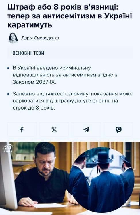 Підписання президентом Закону «Про внесення змін до статті 161 Кримінального кодексу України для реалізації положень Закону України «Про запобігання та протидію антисемітизму в Україні» – це ВАГОМА ДОПОМОГА російській пропаганді, яка споконвічно боролася з «українським націоналізмом і антисемітизмом».
